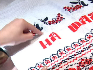 Обсуждение: «чёрный цвет», - говорит Ирина Чернуха уже одновременно со звуковым сигналом, «поищите, нет ли крестов», - продолжает она, «там нет никакого символа, который разделяет жениха и невесту?» - это Анатолий Бугаев. «Что-то глубже должно быть, чем чёрный цвет», - считает Арсен Малиновский. Команда в поиске – все тщательно рассматриваю узоры рушника. «Может, он несимметричный», - предполагает Дарья Талан, но её убеждают в том, что текст на рушнике вполне традиционный. «а с другой стороны не то же самое», - отмечает Дмитрий Литвинов, перевернув рушник, «с этой стороны «обратка»..», но время заканчивается.