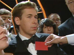 Распорядитель показывает красную карточку Илье Новикову. Команда вынуждена прекратить обсуждение.