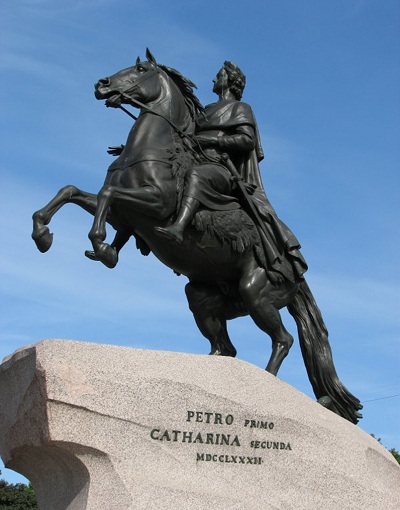 Уважаемые знатоки, внимание на экран!Это памятник Петру I в Санкт-Петербурге, знаменитый «Медный всадник» работы Фальконе. Послушайте, как Тарас Шевченко описал его в стихотворении «Сон»: