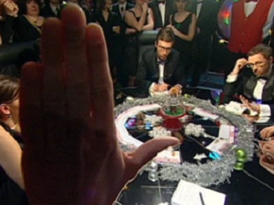 Распорядитель замечает подсказку в зале и показывает красную карточку. Подсказавший покидает зал. Господин ведущий общается с господином Затулой. Вместе они решают, в честь Нового Года, продолжить игру. Команда в отчаянии.
