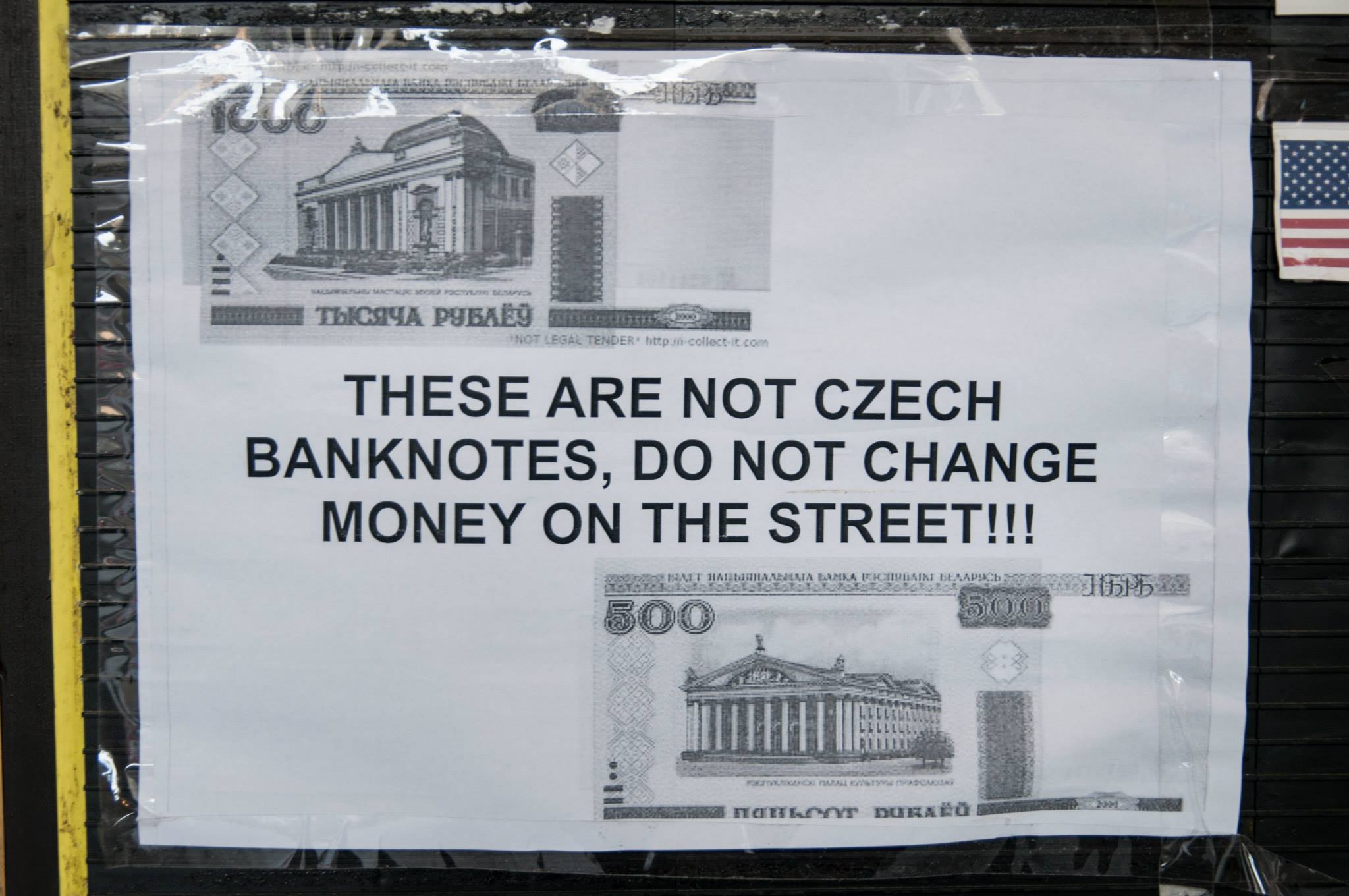 Белорусские рубли очень похожи на чешские кроны! И мошенники на улице пытаются выдать рубли туристам – ведь они намного дешевле крон. А плакат предупреждает – посмотрите – остерегайтесь мошенников, не МЕНЯЙТЕ ДЕНЬГИ НА УЛИЦЕ!