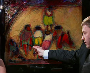 Обсуждение: первые версии, которые появляются за столом: пляжный волейбол, мать-героиня, стрекоза. «Сорока-воровка», - предлагает Борис Левин, «пальцы руки» - версия Владимира Молчанова. Юлия Лазарева предлагает пионервожатую, а Илья Новиков вспоминает о «моей прекрасной няне». Борис Бурда рассуждает даже о Библейских мотивах..