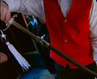 вот здесь есть такой шнурок на эфесе этой сабли. Нам кажется, что поскольку идея «победить или умереть» заключается в том, что, в любом случае, человек не опускает оружия, т.е. не выпустит саблю из рук, а останется с саблей в руке, то брали и как-то привязывали её намертво к руке, чтобы она просто не расставалась с рукой. Если человека убивают, то он остаётся лежать на поле боя с оружием в руке, если он победитель – то уже как победитель он её отвязывает.