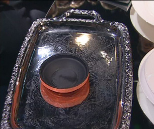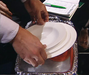 Обсуждение: «как подставка под горячее», - предлагает Анастасия Русова, «для чаевых», - версия Павла Свердлова, « это тарелочка для стрельбы!», - беря в руки тарелочку, догадывается Юрий Филиппов, команде очень нравится версия, но обсуждение продолжается. Осуждаются возможности использования её как теплоизолятора, как подставки под другую посуду, а также возможность наливать в неё соусы, насыпать что-либо или использовать как тарелочку для хлеба.