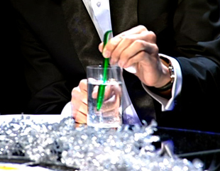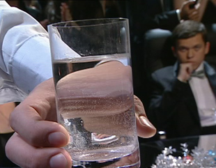 Обсуждение: Евгений Шляхов сразу же предлагает ручку или палец опустить в стакан, а Ольга Резницкая говорит об отражении, следом за чем сразу у нескольких игроков появляется версия о преломлении. Сергей Горбунов и Максим Руссов говорят: «пропускает через себя». Виталий Кузнецов обращает внимание на зеркальный стол, который есть у команды под руками и отражении в нём стакана, «Она не просто отражает, она отражает и преломляет», - говорит он. Команда очень активно обсуждает имеющиеся версии и экспериментирует со стаканом. Евгений Шляхов первым опускает палец в стакан с водой отмечая, что палец при этом кажется кривым. Команда решает, что лучше, всё же, опускать ручку.