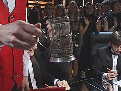 Обсуждение: «штопор, открывать бутылку» - первая версия принадлежит Мишелю Матвееву, Александр Чижов акцентирует внимание на форме предмета, Алксандра Дубичева показывает, что это что-то цилиндрическое. Чернильницу предлагает капитан команды, «подстаканник, может быть» - появляется идея у Дианы Ильягуевой, и находит поддержку Александры Дубичевой. После короткого обсуждения, команда соглашается с тем, что это хорошая версия, но поиски не прекращает: обсуждаются перо и бумага, вилки, ложки, самовар с сапогом, зажигалка, курительная трубка и т. д. На последних секундах, капитан возвращается к версии Дианы Ильягуевой..