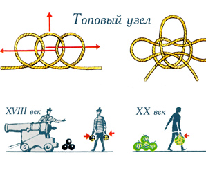 Матросы-канониры обслуживали пушки. Они не только стреляли, но и подносили тяжелые ядра. Из веревки делали топовый узел, в который клали ядро, как в сумку-авоську – посмотрите на экран!