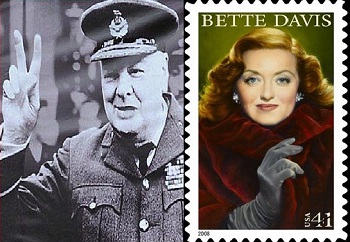 Слева – фотография Уинстона Черчилля. Справа – почтовая марка с изображением кинодивы Бетт Дэвис.